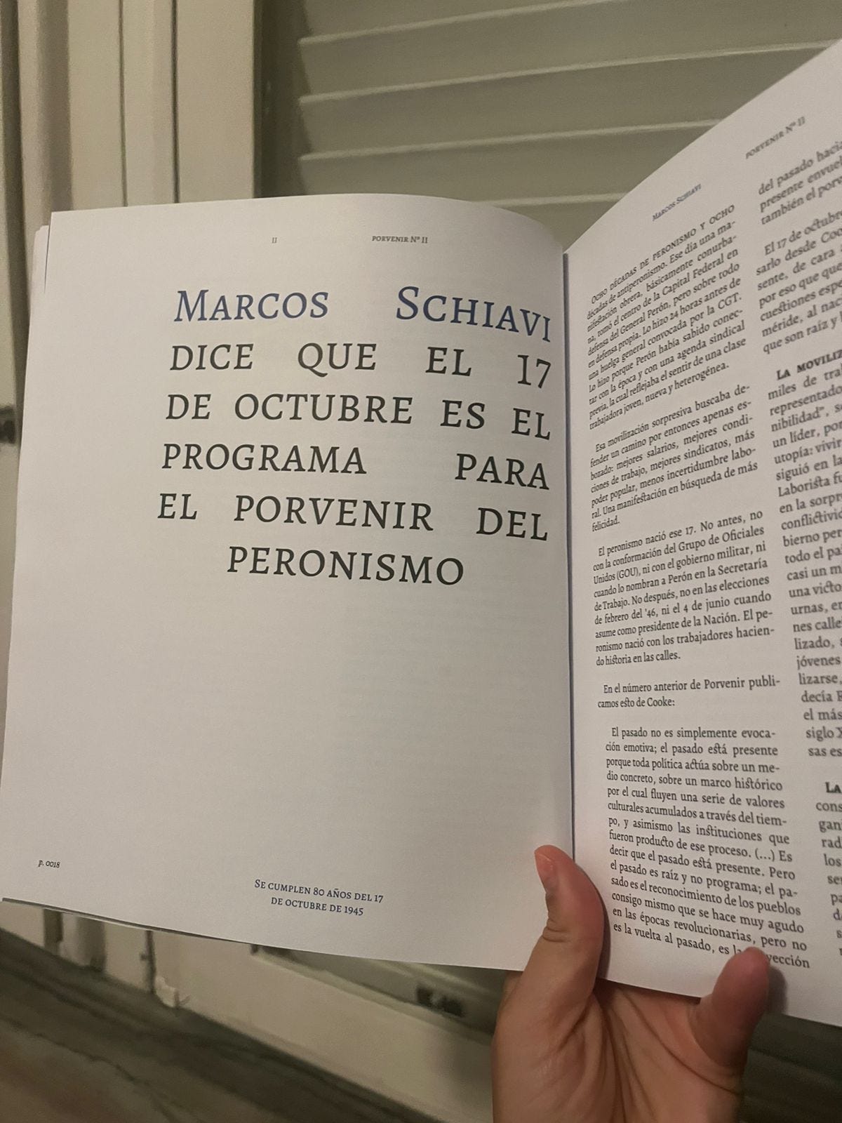 Para hablar de comienzos me pareció oportuno recomendarles el número 2 de Porvenir, una revista en papel que tiene como objetivo inscribirse en un debate presente sin abandonar o esconder las banderas políticas que representa. Allí Marcos Schiavi escribe se cumplen 80 años del 17 de octubre de 1945, En este ensayo, luego de enumerar una serie de cuestiones específicas que atañen a la efeméride que consagra al nacimiento del peronismo, Schiavi dialoga ¿o reescribe? la célebre frase de Cooke: